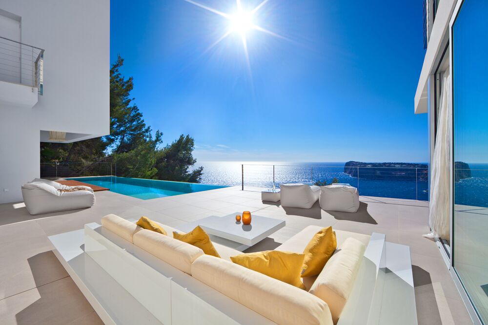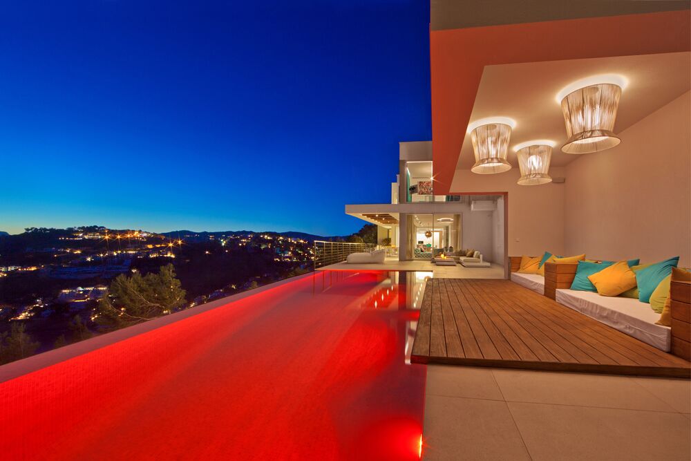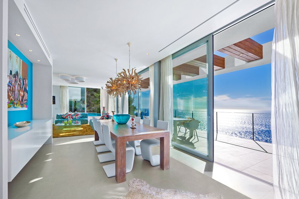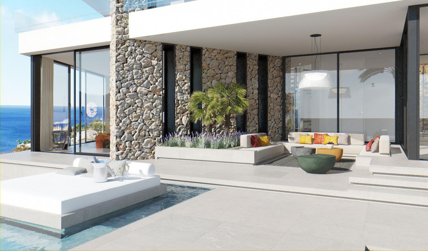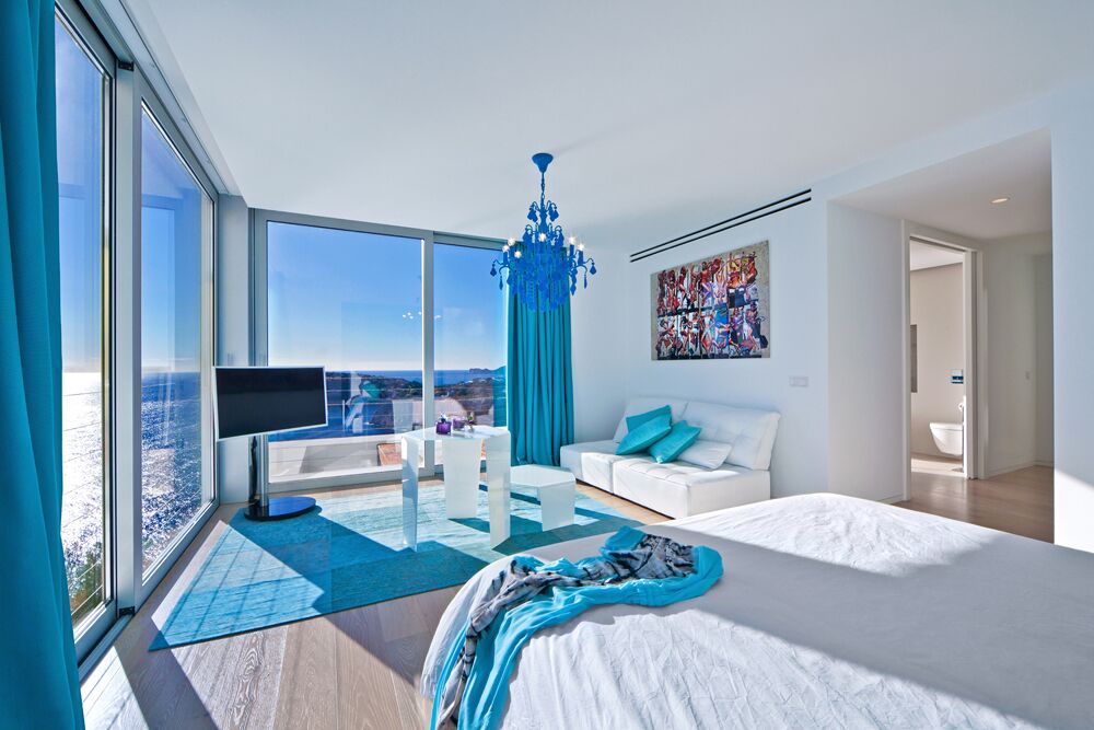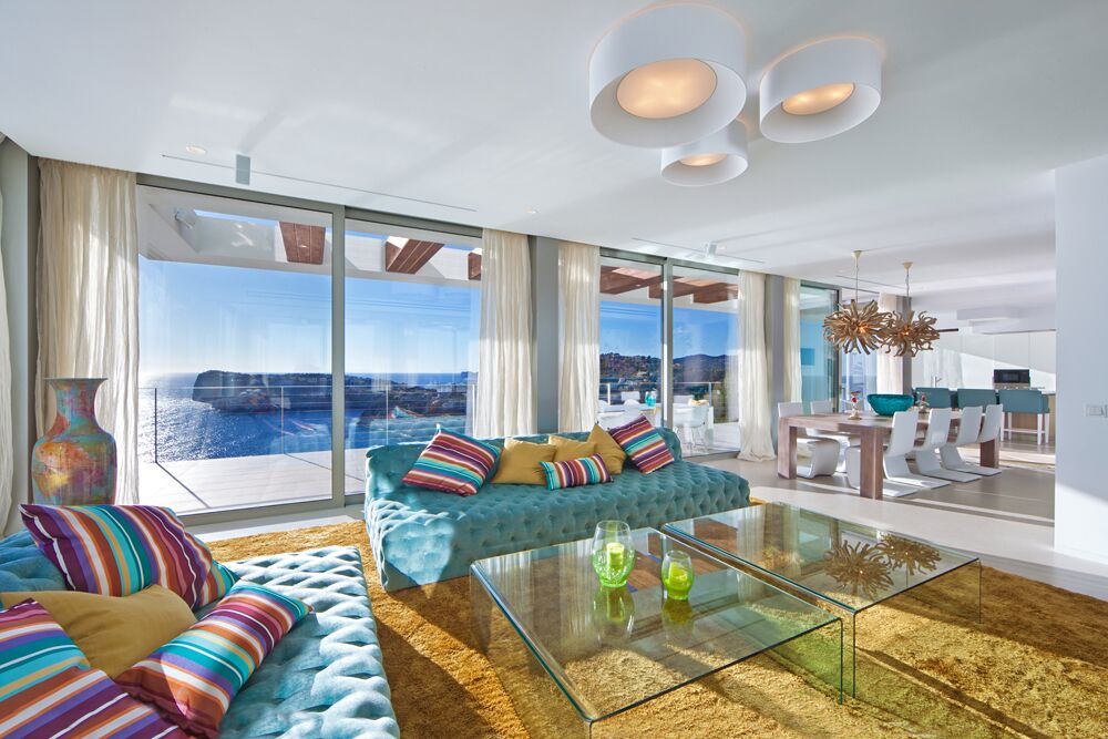 This colorful and modern Ibiza-style luxury chalet offers 440 m2 of living space. It's in a prime and private position in famous Cala Llamp at the end of a cul-de-sac. No doubt the best position beyond first sealine in Cala Llamp. The Final townhall building inspection was approved in 2018.
