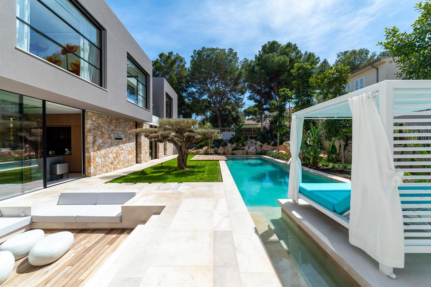 This Family Oasis is located centrally in Santa Ponca, only few minutes to walk from the beach, from the Club Nautico and into town, just 15 minutes by car into Palma de Mallorca. 600m2 luxury living, a 15m pool, 5 bedrooms, 7 bathrooms, a huge private gym, home cinema, outdoor kitchen&barbecue area. Finished in 2023